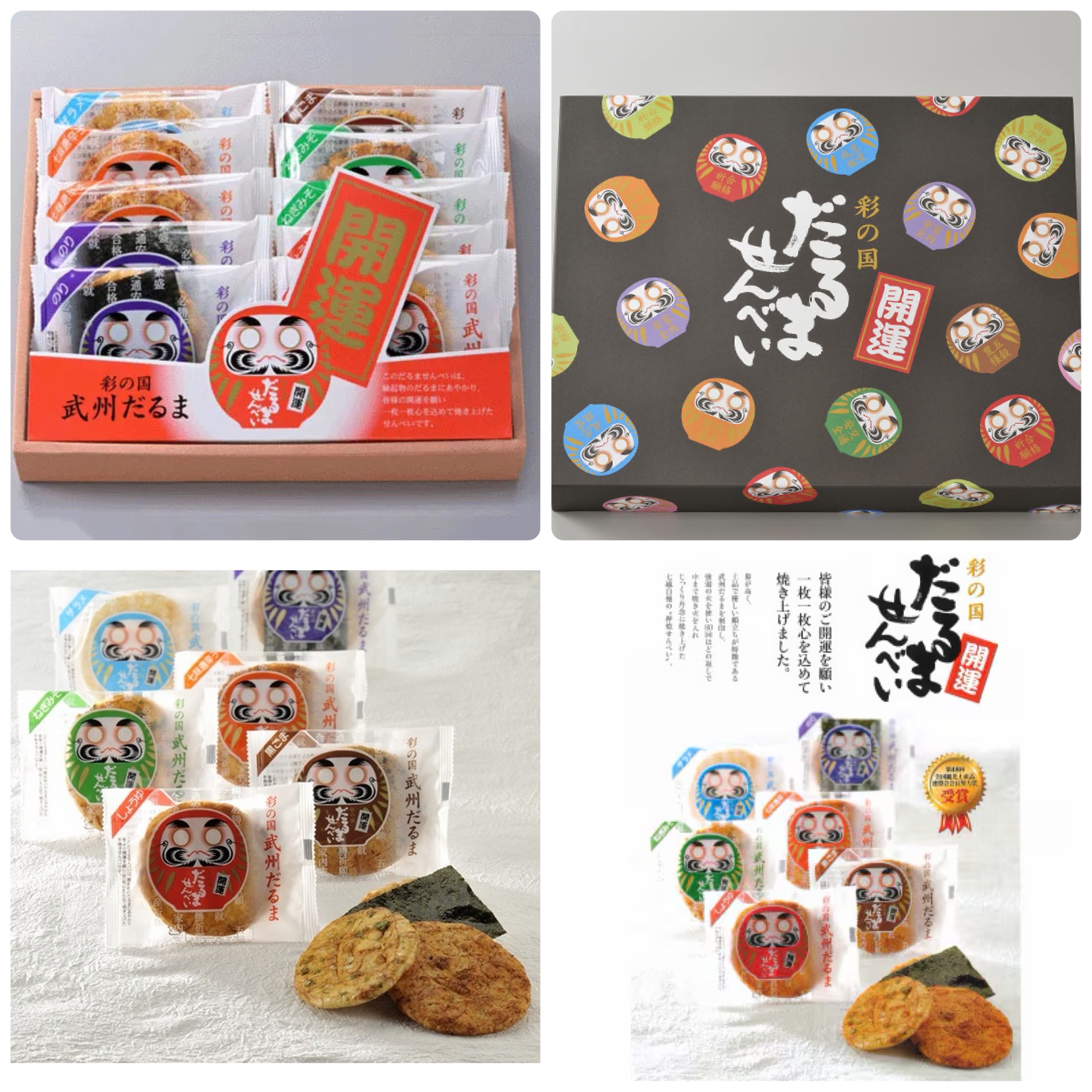 日本達摩祈求好運 包含7個帶有吉祥達摩圖案的米菓,將大家的願望相結合 祈求著商業繁榮,家庭安全和勝利祈禱等字樣印製既送禮禮盒 10枚入 口味:醬油、七味、紫菜、蔥味噌各2個、五穀和芝麻各1個,共10枚 盒子尺寸:23.3 x 27.6 x 7 cm
