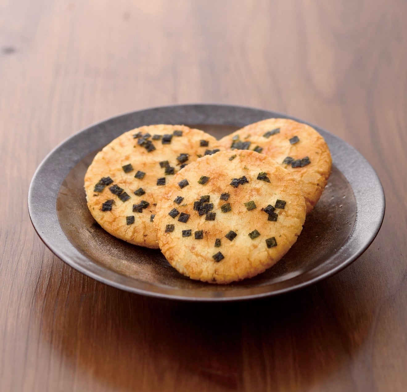 採用秘傳的甘醬油調味,呈現出濃郁醇厚的香醇滋味 用海苔增添鮮美風味,海苔的濃郁鹹香與米菓完美融合