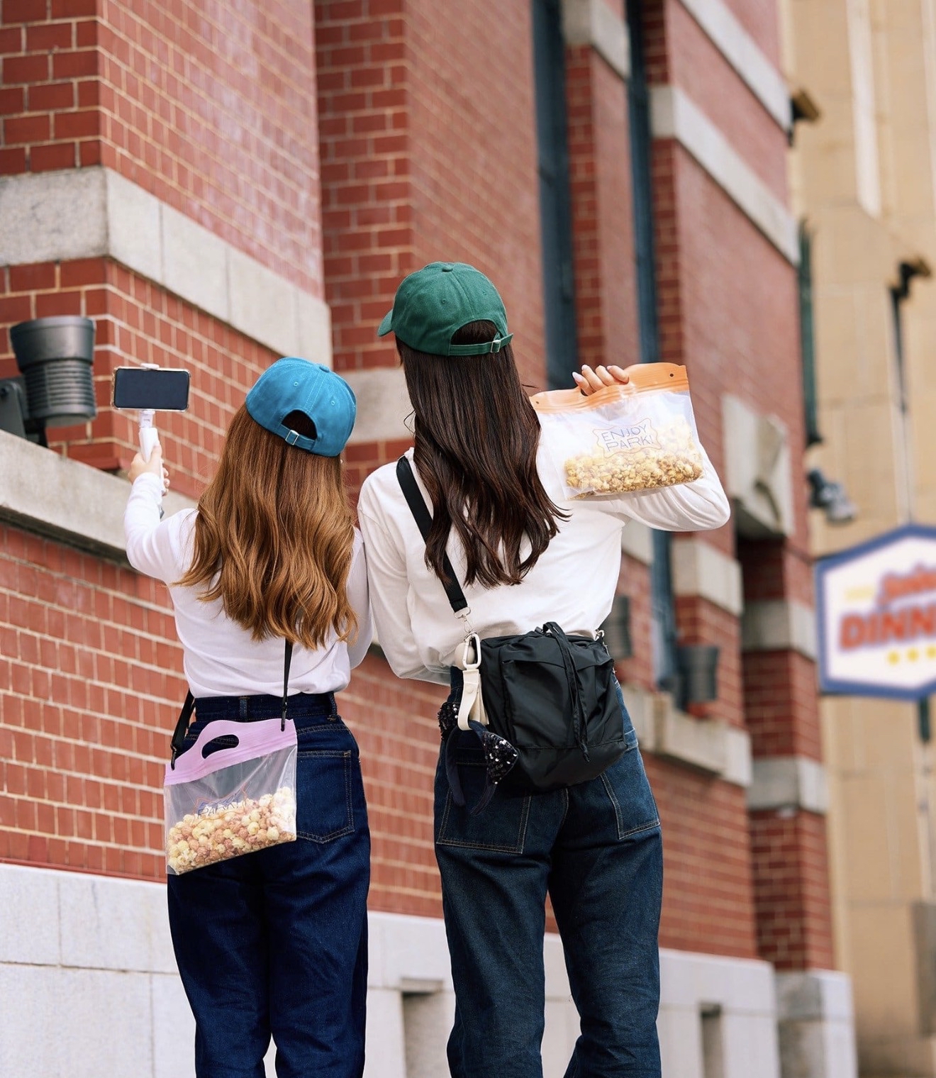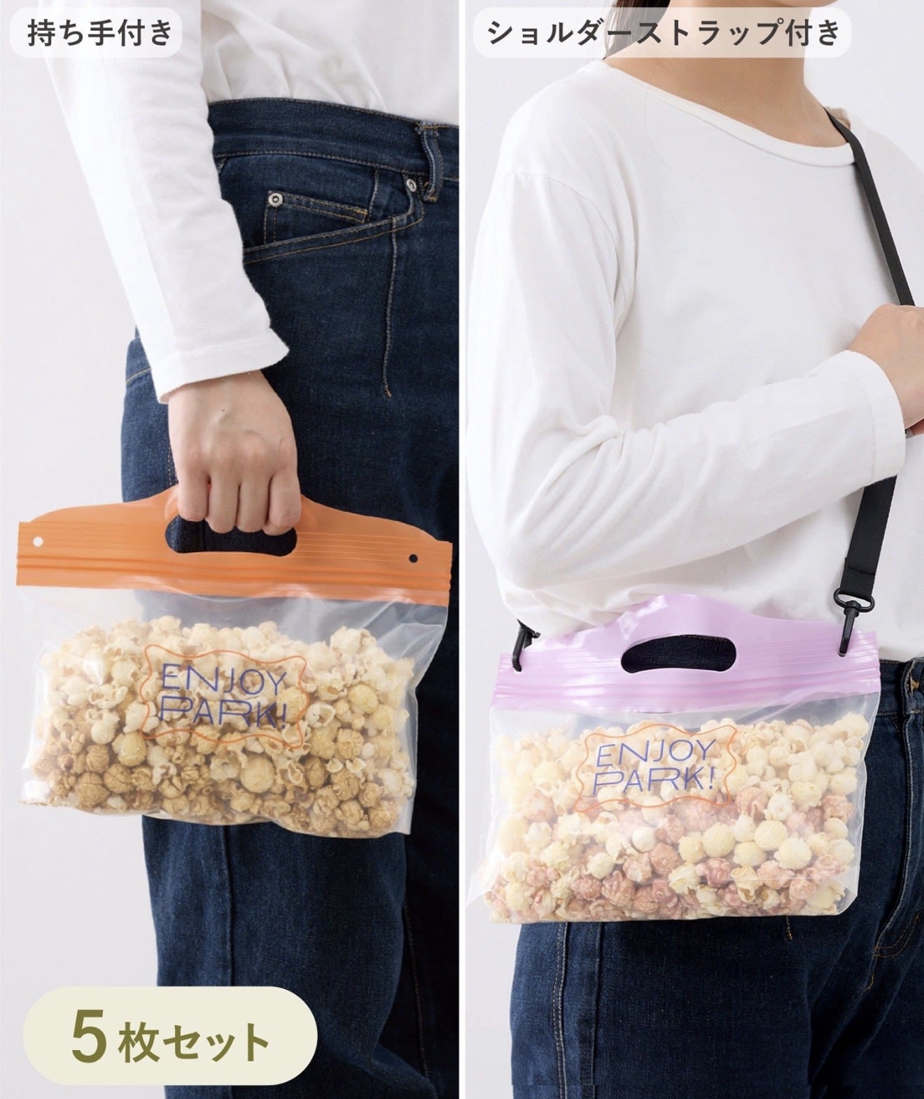 可以和朋友或家人一起分享爆米花的拉鍊袋,配有方便的肩帶