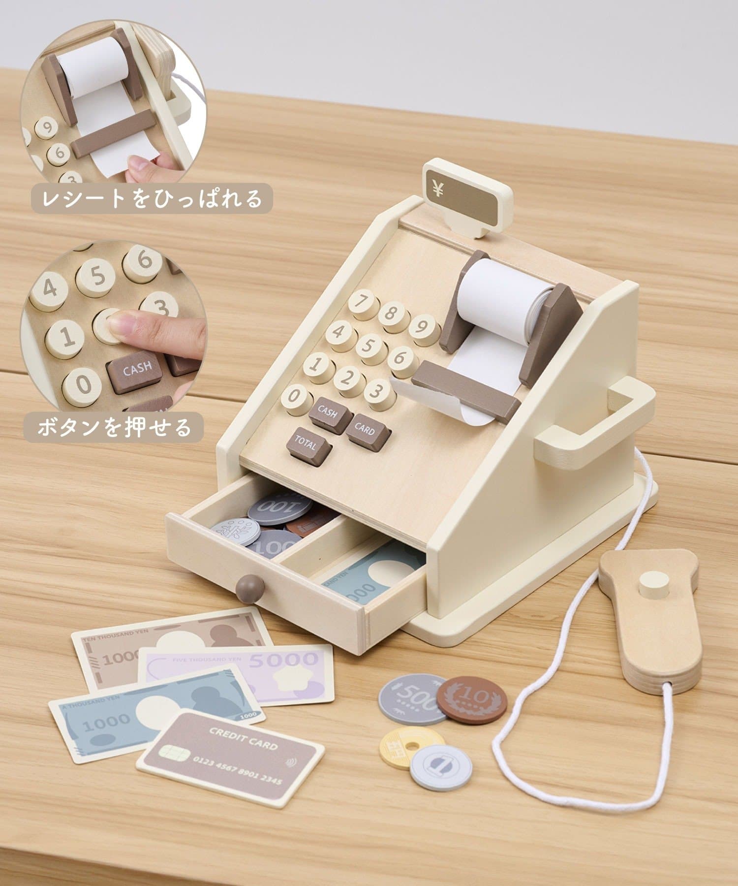 可以幫助孩子了解不同類型的貨幣以及如何購物。 套裝包含一張信用卡,可進行模擬無現金支付。 條碼掃描器透過繩子連接到主機上,因此不會遺失。