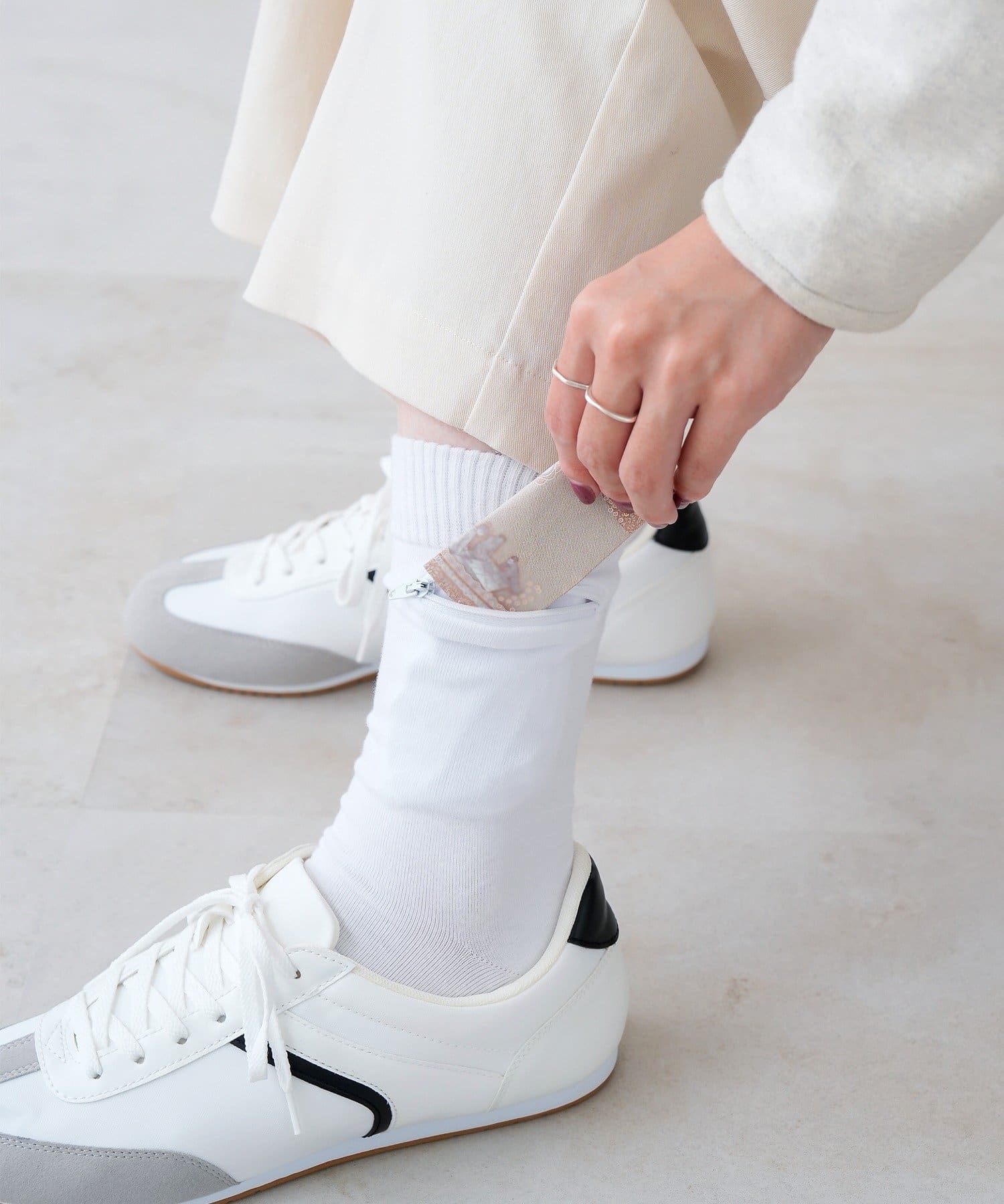外觀與一般襪子無異,但兩側均設有口袋 口袋設計方便您存放小額鈔票或鑰匙等貴重物品
