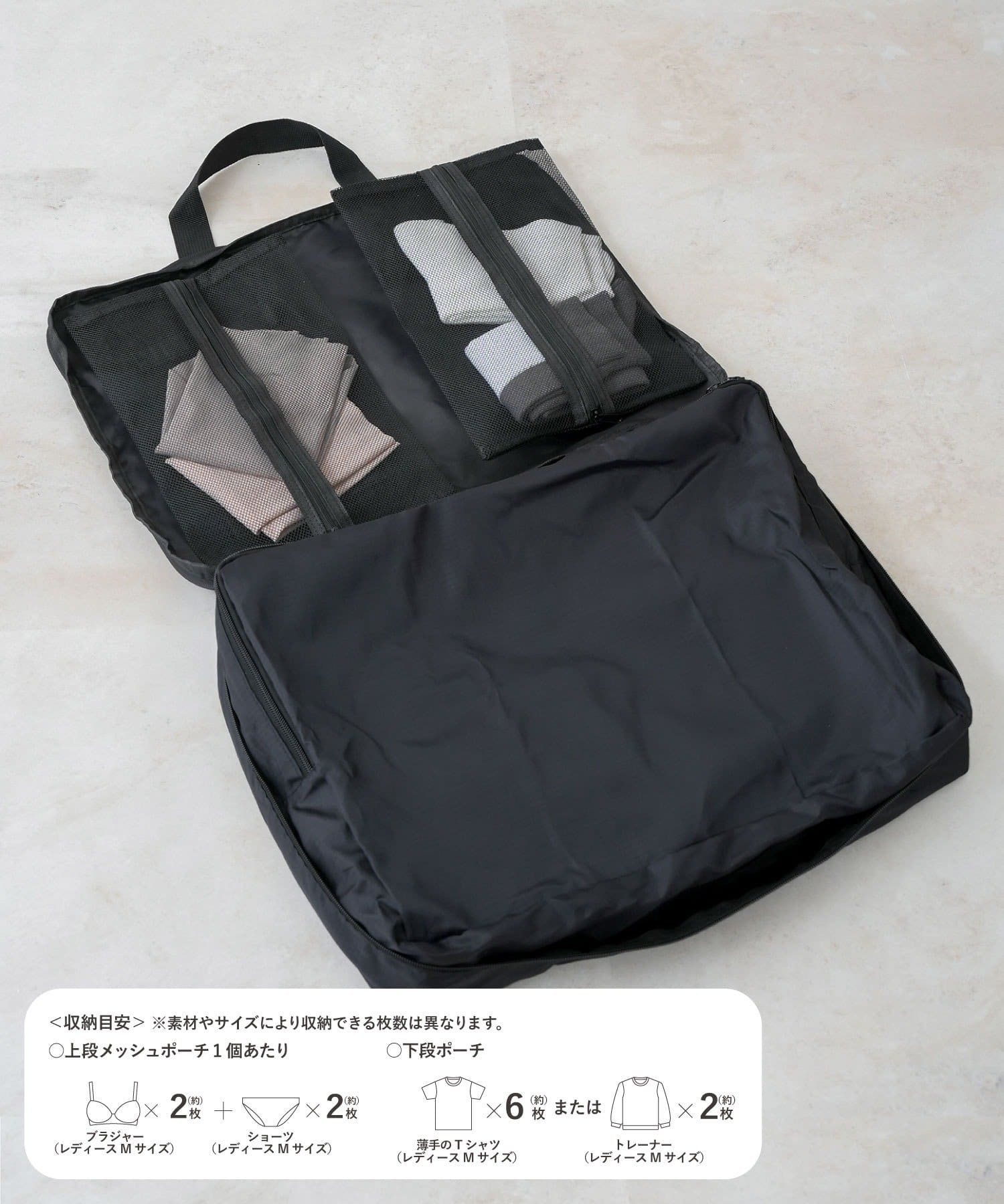 旅行或出差時非常實用的懸掛式收納袋 您可以將內衣和毛巾放在上層網袋,衣物放在下層網袋,整齊地整理衣物 可懸掛在牆上,方便快速取用收納物品 上層網袋可拆卸