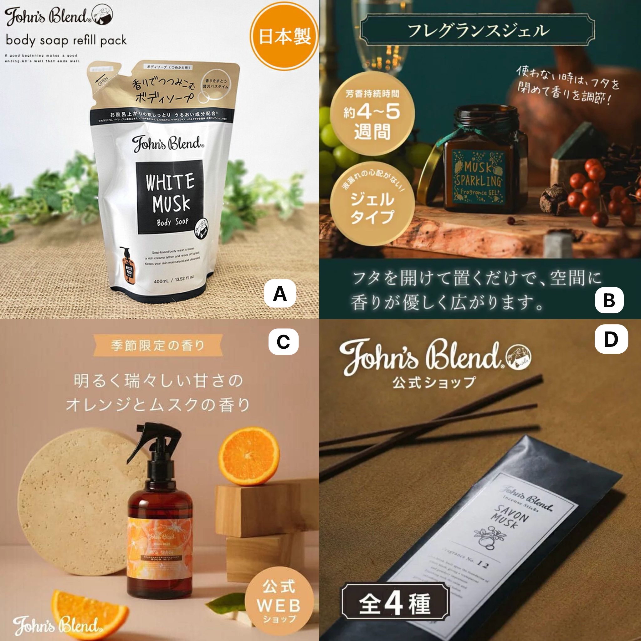 John's Blend的經典香氣香味都好熟悉喇 之前室內香薰系列都好多好評 透過超過49年專業調香經驗的品牌調香師John 沐浴系列已經係日本被大家搶爆喇 今次仲要係最出名嘅〖#白麝香 〗丫 A White Musk白麝香沐浴乳補充裝400ml $59 無著色、無礦物油、無矽靈、無防腐劑、無酒精 弱酸性配方,敏感肌都可以使用! 只需要少量便能產生綿密泡沫,輕鬆清洗滋潤皮膚,超級舒適! B 氣泡麝香香氛膏 $69 清爽的白葡萄香氣,搭配白麝香和琥珀的深沉甜美,與青檸的清新氣息,打造出成熟而甜美的香氛 C 室內香薰噴霧 香橙麝香280ml $69 細緻噴霧,均勻分布在空氣中,清新不刺鼻,能淨化空氣令室內持久充滿清香 可用於衣物/家中/辦公室/廁所等地方 D 線香──(25支) $69 4款選擇 A.White Musk白麝香 B.Musk Jasmine茉莉麝香 C.Savon Musk泡泡麝香 D.Musk Kinmokusei金木犀麝香 煙霧包覆著香氛,融入空間,焚香後,也能享受餘香。 燃燒時間約40分鐘