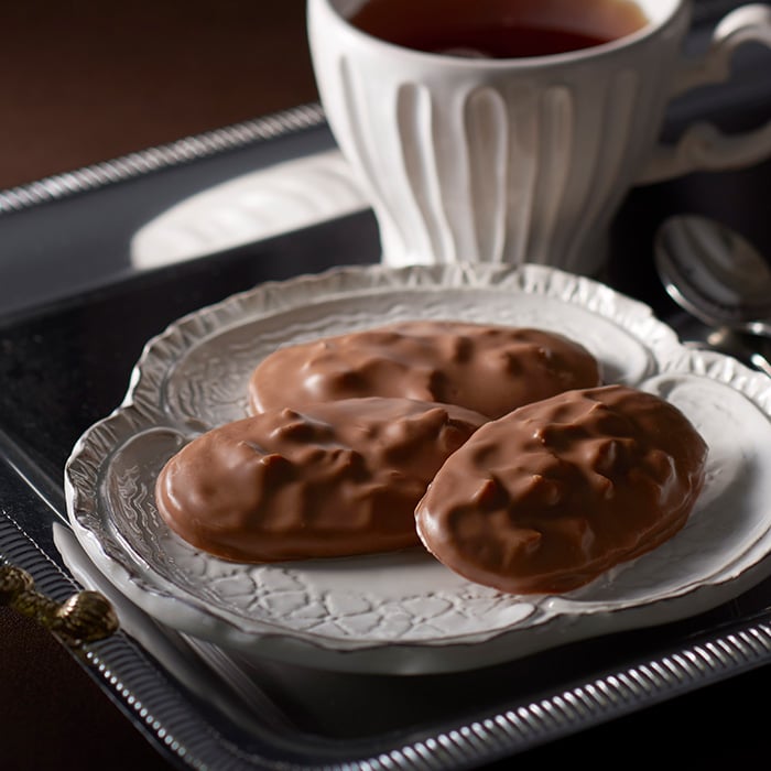 將澳洲堅果和杏仁放在脆皮烤餅上,並塗上頂級比利時朱古力 醇厚的牛奶巧克力和脆餅在您的嘴中散發出神奇的和諧和香氣