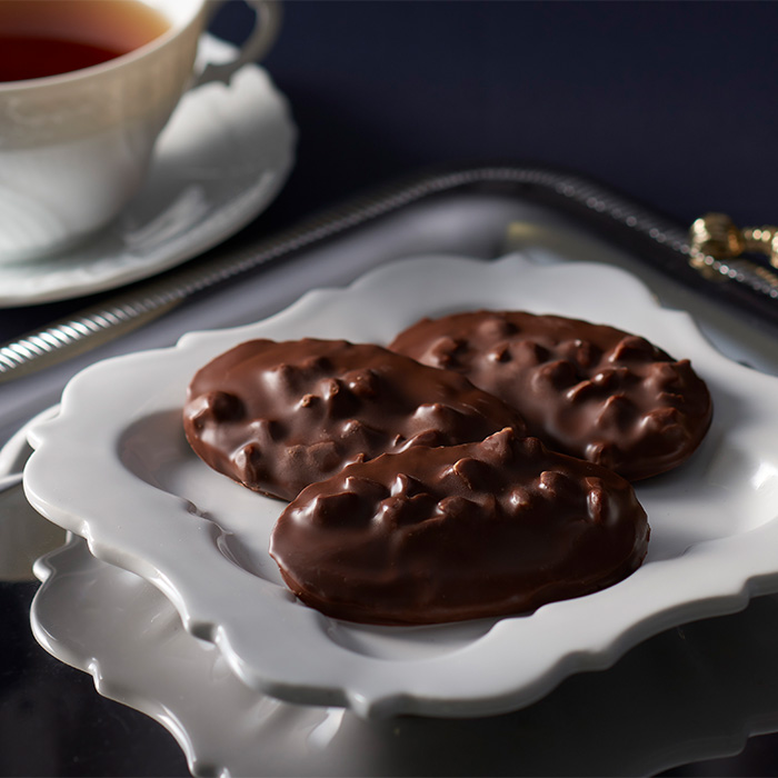 將澳洲堅果和杏仁放在脆皮烤餅上,並塗上頂級比利時朱古力 醇厚的牛奶巧克力和脆餅在您的嘴中散發出神奇的和諧和香氣