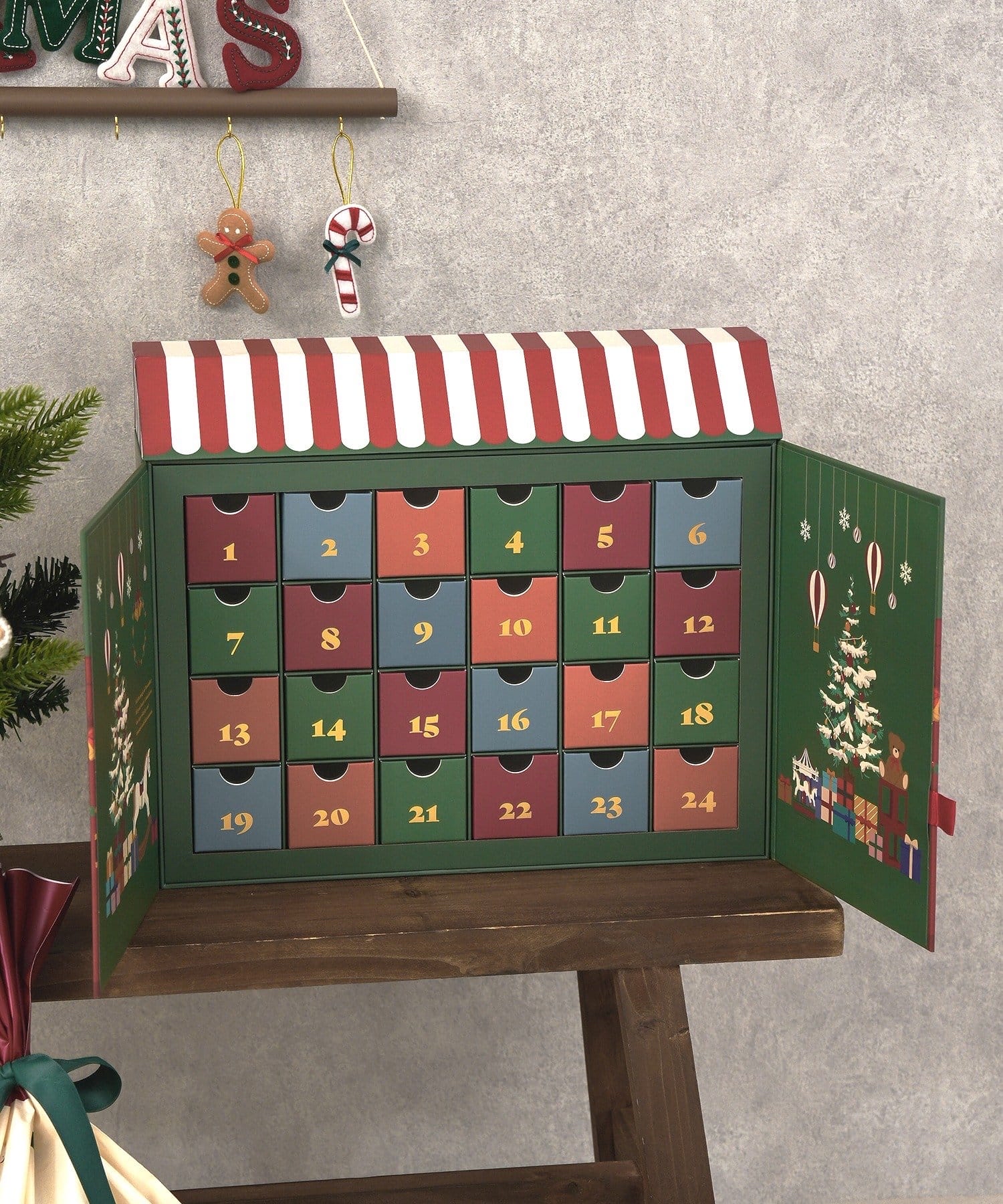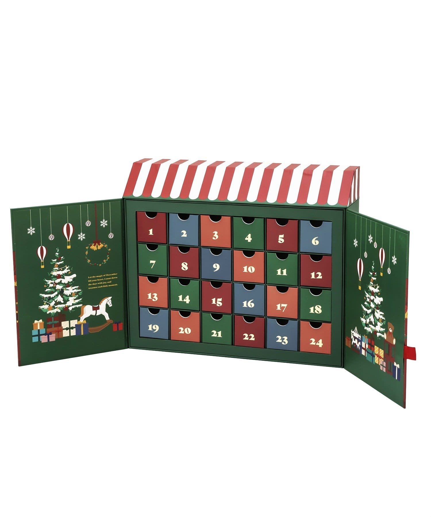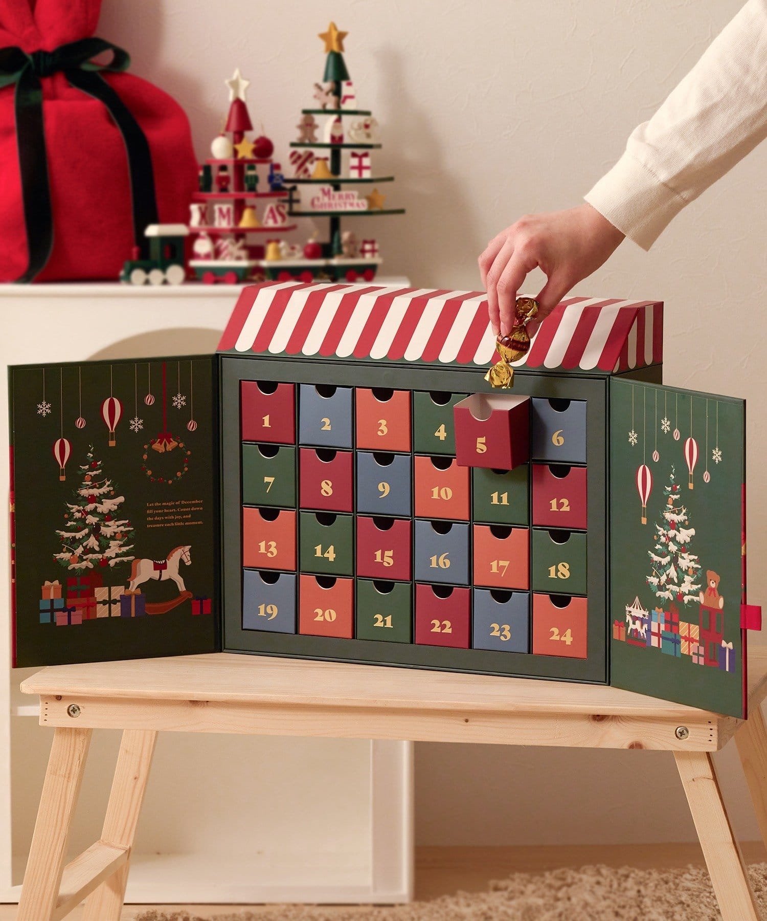 可以享受從12月1日到平安夜的倒計時,是抽屜式的節日曆。 可以放點心和飾品等一天一天享受 也推薦作為送給大人的禮物 像繪本一樣的設計 以聖誕市場店鋪為形象的外觀,就像繪本的第一頁一樣