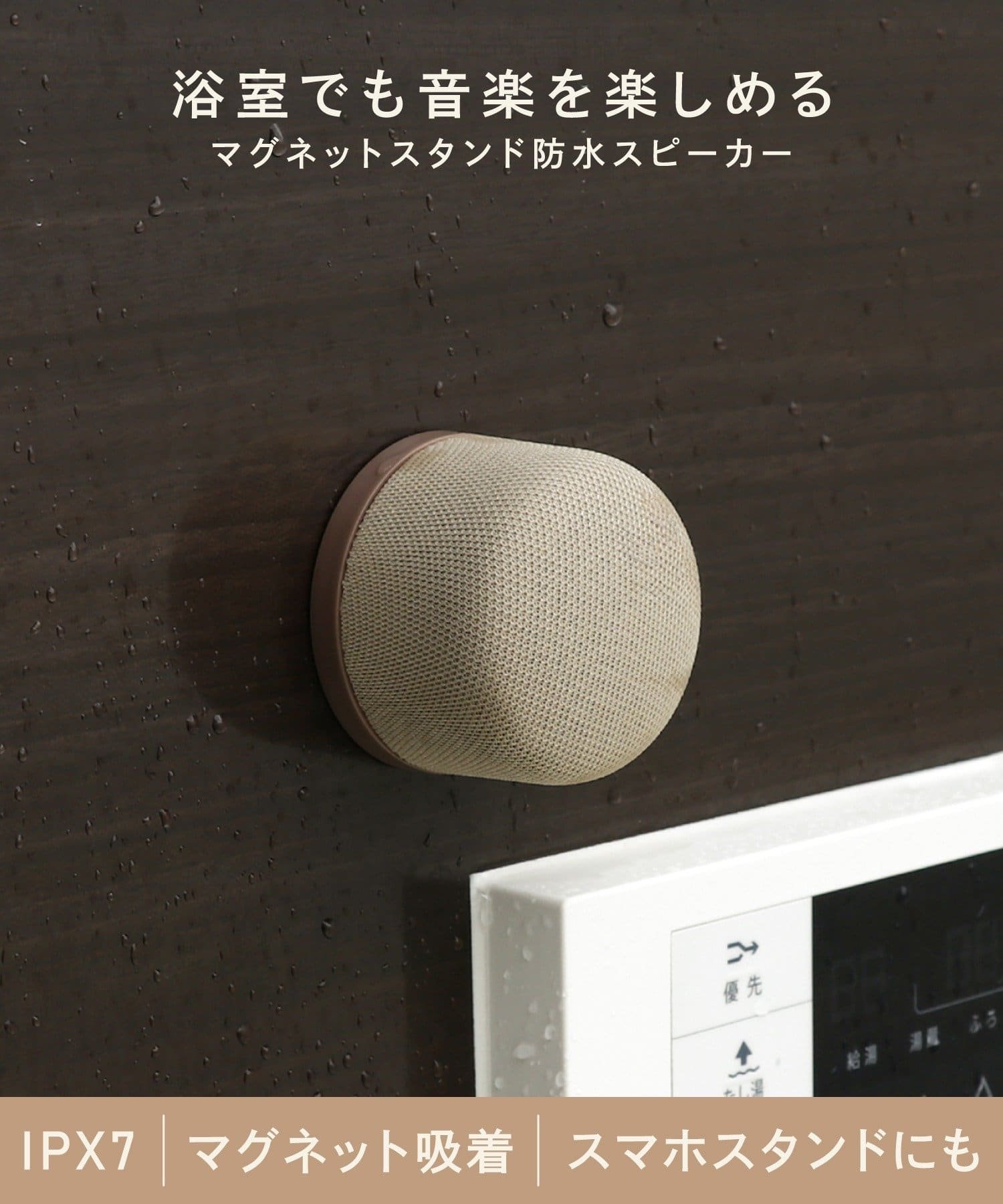 棕色/象牙色 內容物:揚聲器本體×1、金屬環×1、說明書兼保證書×1 磁性安全對應機型(2025年7月現在):iPhone12~iPhone16系列(※裝有不磁性安全功能的智慧手機或保護殼時,請使用附帶的金屬環。) 通訊方式:藍芽Ver.5.4 最大通訊距離:約10m 對應配置檔案:HFP/A2DP/AVCTP 輸出聲壓等級:78±3dB 連續播放時間:<音樂播放時>約3小時(音量75%時) 在浴室也能享受音樂,防水效能相當於IPX7的磁性支架防水揚聲器 磁鐵吸附式,可以固定在有磁性的牆面上使用 可以安裝在Magsafe對應的智慧手機或智慧手機外殼上 也可以作為智慧手機支架,所以在觀看影片和通話時很方便 一邊泡澡,一邊洗碗,一邊做飯 在各種場合都很活躍